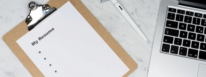Тифлокомментарий: цветная фотография. На белом покрывале стоит открытый ноутбук с клавиатурой на латинице. На ней лежит резюме на английском языке, на нем -— суккулент в маленьком горшке.