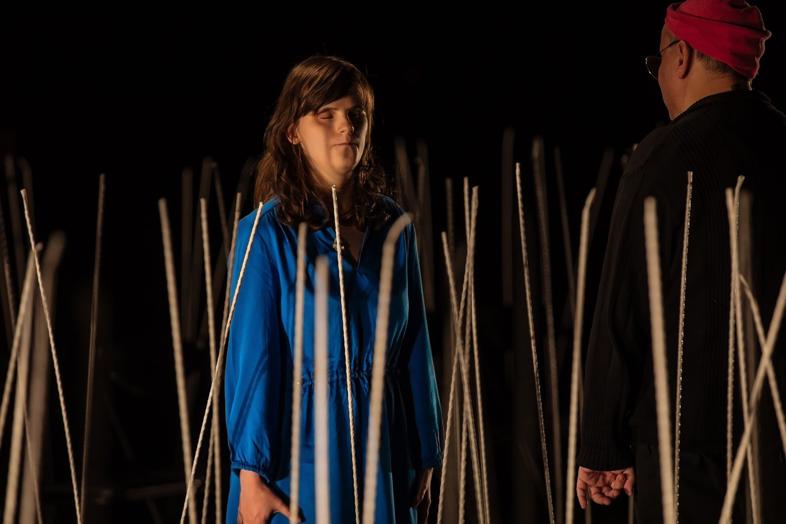 Тифлокомментарий: цветная фотография. В темном зале среди поднимающихся из пола длинных палочек, похожих на колосья, друг напротив друга стоят два актера: темноволосая девушка с закрытыми глазами в синем платье и крупный мужчина в темных очках, черной одежде и красной шапке.