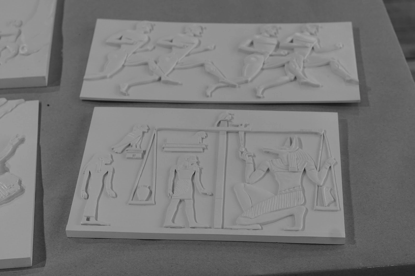 Тифлокомментарий: черно-белая фотография. На столе лежат четыре тактильные копии. На одной представлена сцена с соревнованием по бегу с древнегреческой амфоры. Четыре одинаковых бегуна изображены попарно: руки согнуты в локтях, левые колена подняты и пересекают ноги впереди бегущих спортсменов, правые ноги отведены назад. На второй копии — изображение суда Анубиса из древнеегипетского Папируса Ани. Рядом с правой чашей огромных весов сидит, опираясь на колено, Анубис — бог с телом мужчины и головой шакала. Рядом с левой чашей стоит человек. На правой чаше весов перо, на левой — кувшин с сердцем умершего.