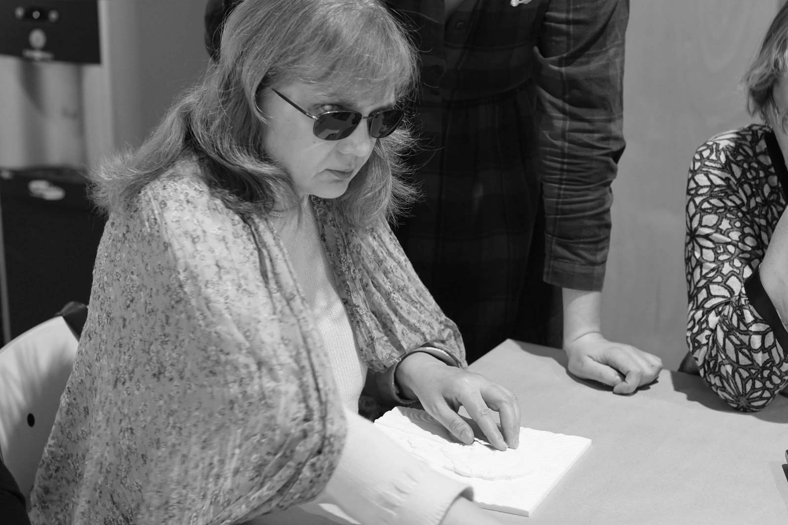 Тифлокомментарий: черно-белая фотография. Женщина за столом осматривает тактильную копию. У нее светлые распущенные волосы чуть ниже плеч, темные очки. На ней теплый светлый свитер, на плечи наброшен цветастый тонкий платок. Это Лариса Овцынова. За столом рядом сидит еще одна женщина. Между ними стоит, опираясь на стол, девушка в клетчатом платье.