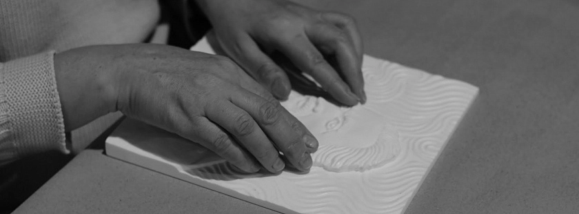 Тифлокомментарий: черно-белая фотография. За столом сидит лысеющий мужчина средних лет в темном свитшоте и пожилая женщина с седыми волосами в кофте с цветочным узором. Они вместе осматривают лежащую на столе тактильную копию, при этом женщина направляет руки мужчины.