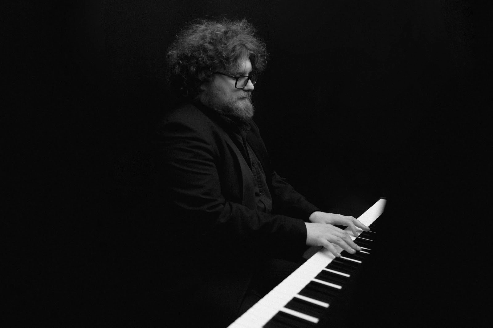 Тифлокомментарий: черно-белая фотография. На черном фоне - играющий на пианино крупный мужчина в черной рубашке и черном костюме, в очках, с всклокоченными вьющимися волосами и бородой.