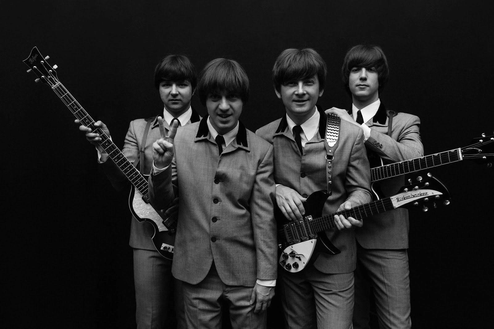 Тифлокомментарий: черно-белая фотография. На черном фоне – четверо молодых мужчин, похожих на музыкантов группы «The Beatles». У них прически c ровной челкой до бровей и удлиненными около ушей волосами. На молодых людях светлые костюмы с узкими брюками и застегнутыми на все пуговицы приталенными пиджаками с отложными черными воротничками. Стоящий впереди молодой человек правой рукой показывает знак победы – указательный и средний пальцы растопырены в виде английской буквы V, остальные сжаты в кулак. У трех остальных в руках гитары.