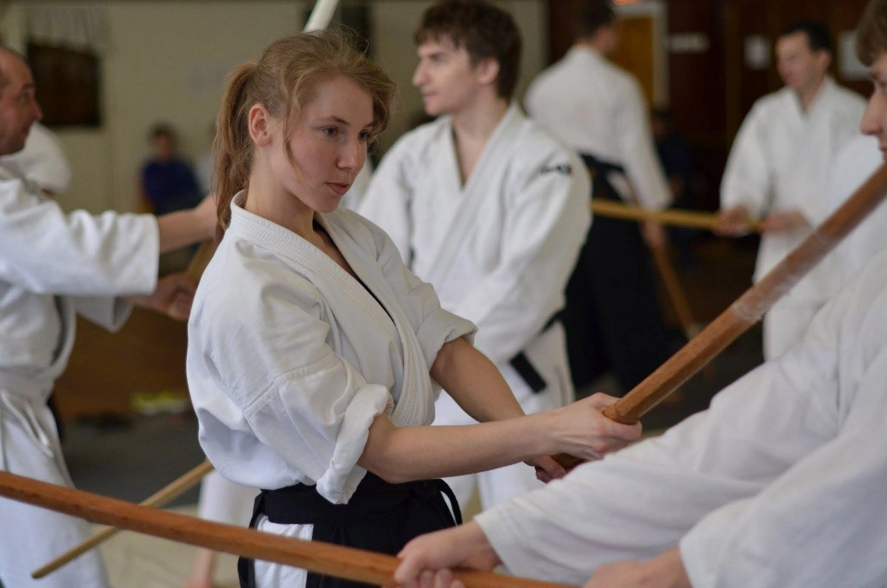 Тифлокомментарий: цветная фотография. В светлом зале проходят занятия по айкидо. Ученики в белых кимоно выполняют парные упражнения с палками. На переднем плане светловолосая стройная девушка с забранными в хвост волосами. Она обеими руками держит посох, словно готовясь нанести удар, и внимательно смотрит вперед.