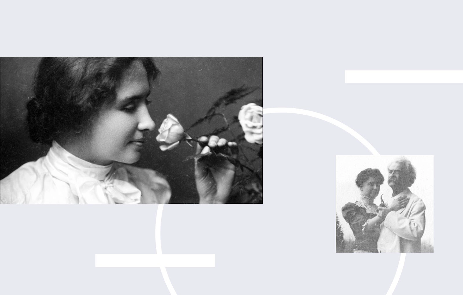 Тифлокомментарий: фотоколлаж на сером фоне. Справа черно-белая фотография молодой женщины в профиль с темными, убранными в пучок, волосами. На ней белая блузка с бантом на шее. Левой рукой она подносит к носу белую розу. Это Хелен Келлер. На черно-белом фото справа Хелен Келлер стоит рядом с Марком Твеном. Это пожилой мужчина с пышными волосами и усами в просторной рубашке. Хелен в приталенном темном платье со светлым воротником стоит вполоборота к писателю и кладет свою руку ему на грудь. Марк Твен держит в левой руке курительную трубку.