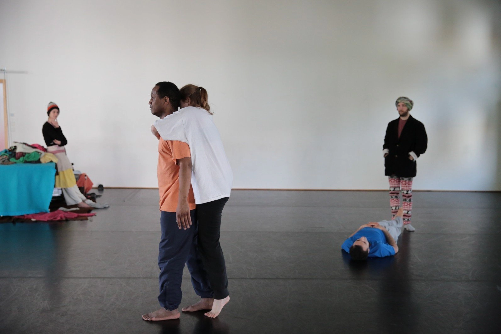 Тифлокомментарий: цветная фотография. Репетиция коллектива Acajou Danse. Танцевальный класс с белой стеной и черным полом. В центре стоит темнокожий мужчина, сзади его обнимает за плечи девушка. Оба босиком, в футболках и спортивных штанах. Справа двое мужчин. Один в синей футболке и серых штанах лежит на полу на спине, держит переплетенные руки на уровне пояса. Второй стоит у него в ногах. На нем черный пиджак и яркие штаны с орнаментом, на голове у него цветастый тюрбан. Чуть дальше слева стоит девушка в шапке, черной блузке и цветной юбке. Она прислонилась к столу, покрытому голубой тканью, на котором и около которого свалена в кучу разноцветная одежда.
