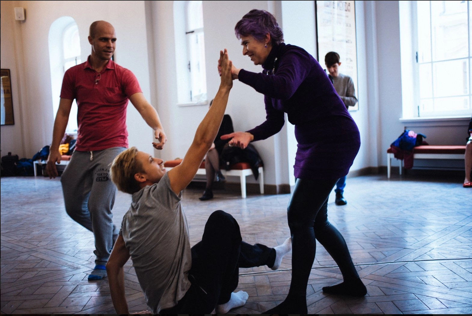 Тифлокомментарий: цветная фотография. Светлый зал с большими окнами и паркетным полом. На переднем плане молодой мужчина-актер и Ирина Поволоцкая. Мужчина сидит на полу в центре зала. Левой рукой он опирается о пол, а правую вытянул вперед и вверх. Перед ним стоит немного наклонившись Ирина. Она держит мужчину за левую руку и тянется к нему. На мужчине серая футболка, черные штаны и белые носки. На Ирине фиолетовая туника и черные леггинсы. К ним подходит человек с бритой головой. На нем красная рубашка-поло, серые спортивные штаны и серые носки. Он протягивает руку в сторону Ирины. Все трое улыбаются.