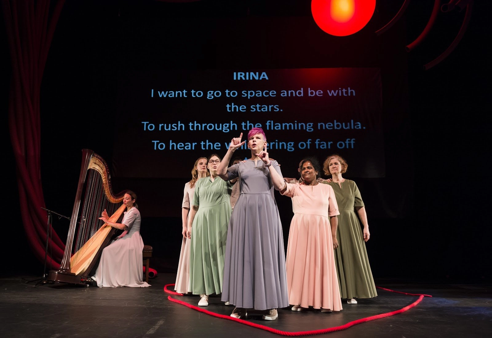 Тифлокомментарий: цветная фотография. На сцене группа из семи женщин в длинных платьях разных цветов. Они стоят в форме треугольника, каждая из них положила руку на плечо женщины впереди. Во главе треугольника стоит Ирина Поволоцкая в фиолетовом платье и жестикулирует. На полу вокруг женщин лежит красный канат, над ними висит красный светящийся шар. В левом дальнем углу сцены женщина в белом платье играет на арфе. Сзади висит экран, на который проецируется текст на английском языке — это слова Ирины. Перевод текста: «Через туманности промчаться огневые, услышать шепот запредельных звезд - я улететь мечтаю с шарика земного, к живому свету квантовых дорог».