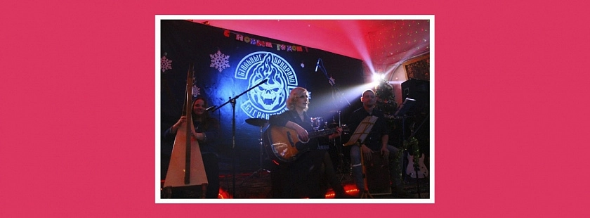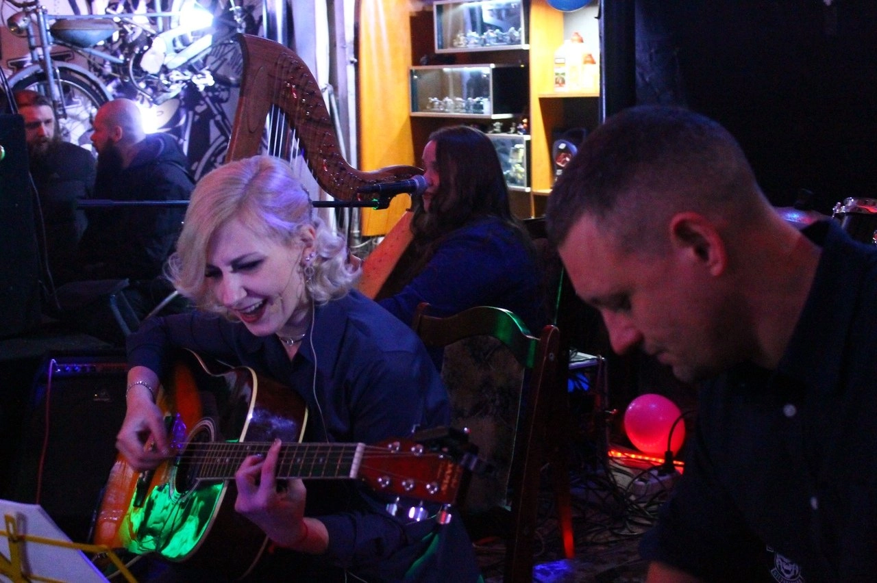 Тифлокомментарий: цветная фотография. Клуб. На сцене группа Ring of Brodgar. Вдалеке за арфой сидит Анна Александрова. Ника Дербенец играет на гитаре и поет, это худая блондинка с ярко подведенными глазами, красными губами и острым длинным носом. Ее пепельные волосы уложены в прическу в стиле 30-х годов. Рядом сидит склонив голову Даниил Глушков. За столиком сидят двое крепких бородатых мужчин. На белой стене клуба черный рисунок мотоцикла, поверх которого прикреплены детали настоящего мотоцикла. Рядом на застекленных полках стоят миниатюрные модели мотоциклов.
