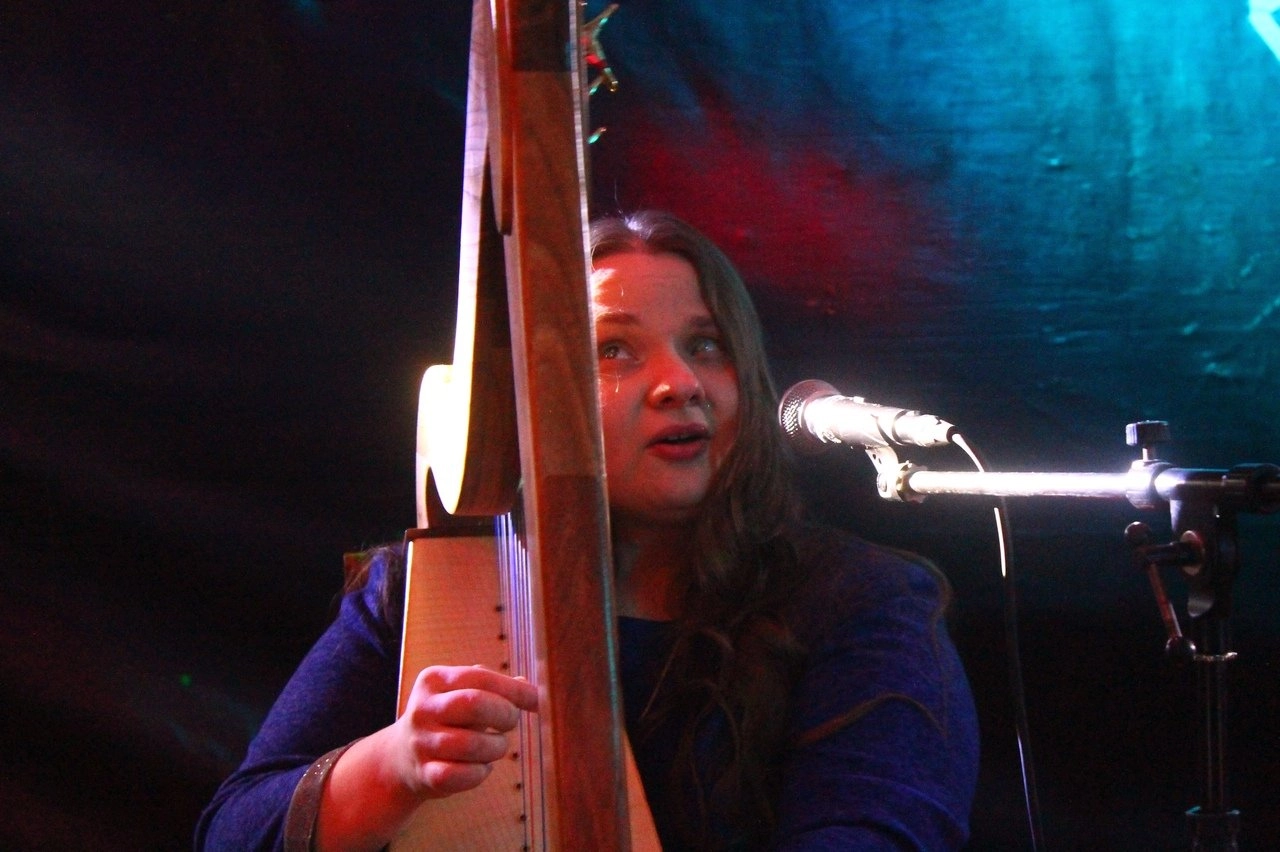 Тифлокомментарий: цветная фотография. Полная шатенка с длинными волнистыми волосами играет на арфе и поет. У девушки округлое лицо с крупными чертами: темные глаза, большой нос и пухлые губы. На ней синий наряд с длинным рукавом. Это Анна Александрова. Перед ней стоит микрофон на стойке. Девушку освещают разноцветные лучи софитов.