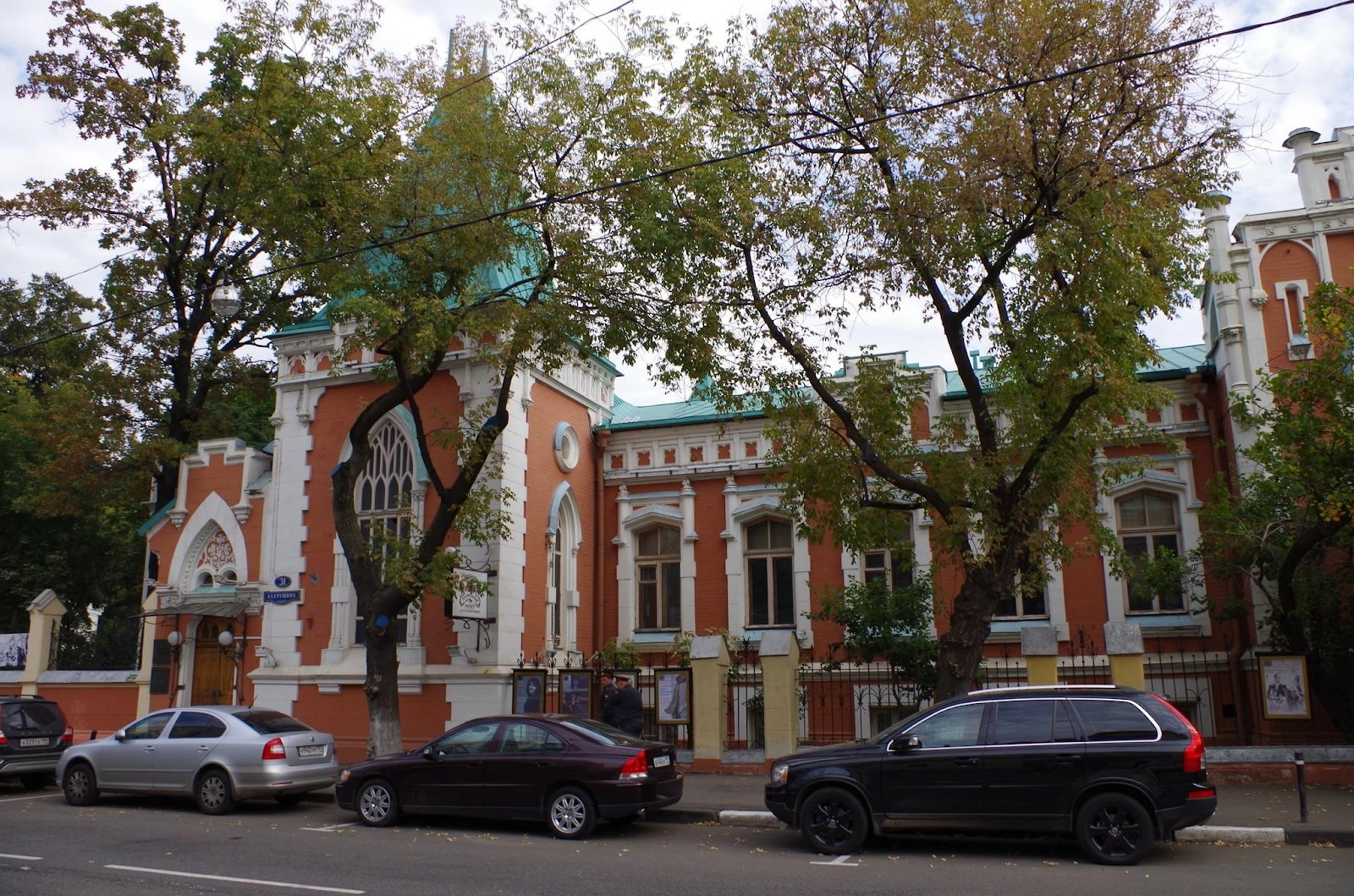 Тифлокомментарий: цветная фотография. Пасмурный летний день. Здание Театрального музей имени Бахрушина с ассиметричным продольным фасадом из красного кирпича, обильно украшенным белыми элементами декора и высокими прямоугольными окнами с нарядными наличниками. В левой части особняка расположена башня с готическими окнами и конусообразной зеленой крышей. За домом и на тротуаре перед ним — ветвистые деревья, вдоль дороги в ряд стоят несколько машин.