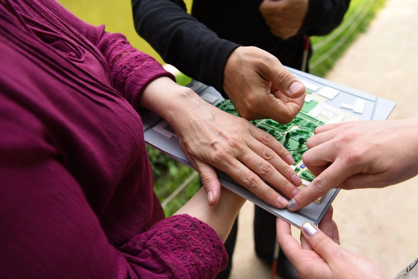 Тифлокомментарий: цветная фотография. Три человека осматривают тактильную схему ботанического сада. На квадратной схеме зеленым выделены зоны с растительностью, голубым – водоемы, бежевым – пешеходные дорожки, а белым – оранжереи и постройки. Женщина в бордовой кофте держит тактильную схему на правой ладони и изучает ее левой рукой. Ее движения направляет женская рука с серебристым маникюром. Мужчина в черном левой рукой держит белую трость, правую заносит над схемой.