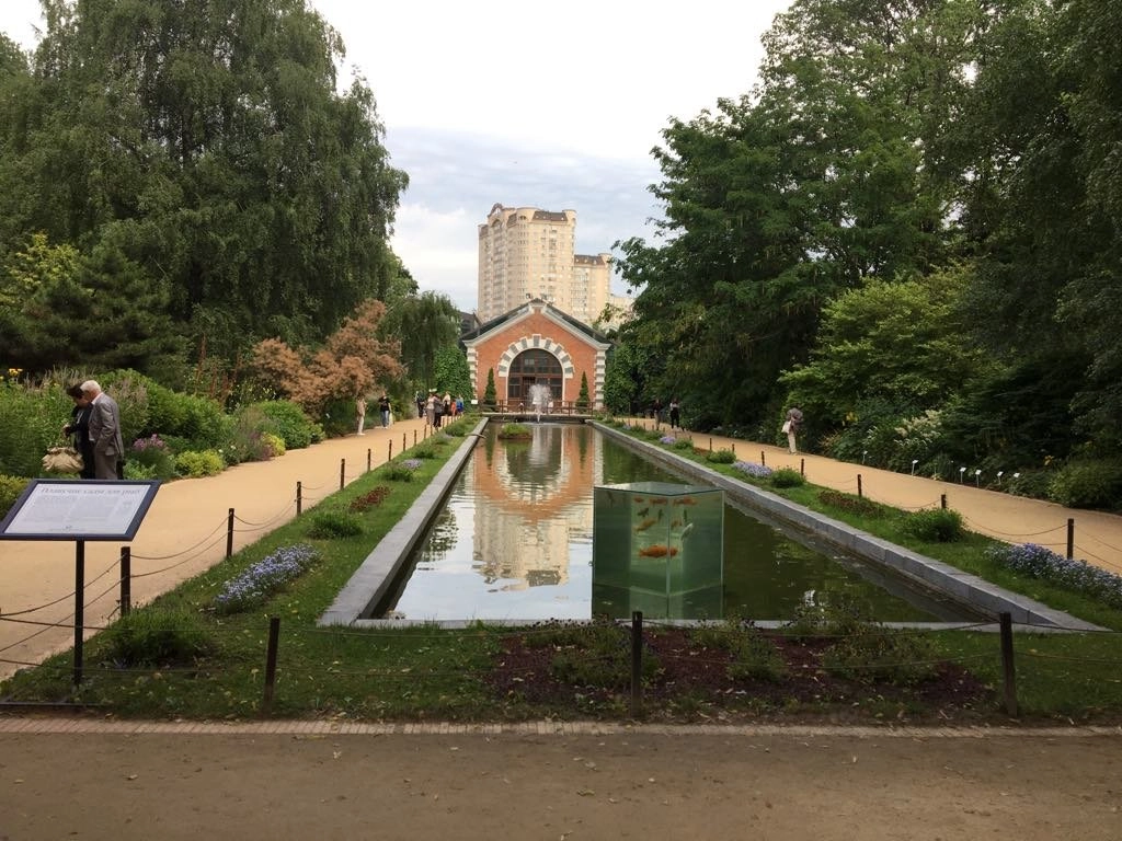 Тифлокомментарий: цветная фотография. Солнечный летний день. Центральная аллея ботанического сада МГУ «Аптекарский огород». Прямоугольный канал в обрамлении зеленого газона. На переднем плане над водой возвышается аквариум – это стеклянный куб со сторонами длиной около одного метра. Воздушный аквариум заполнен водой, в нем плавают небольшие рыбки: золотые караси и продолговатые японские карпы-кои, белые с красными пятнышками. С другой стороны канала бьет фонтан. По бокам пешеходные грунтовые дорожки, раскидистые высокие деревья, кустарники с желтыми и розовыми цветами. Позади канала оранжерея - невысокое строение из красного кирпича с треугольной крышей и застекленным арочным входом. Вдалеке виднеются две белые жилые многоэтажки.