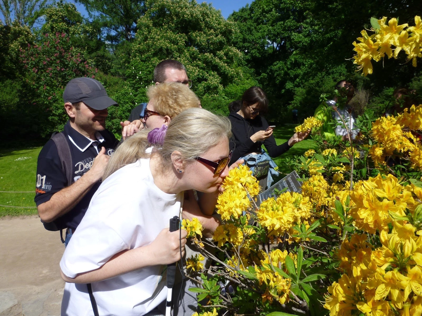 Тифлокомментарий: цветная фотография. Летний солнечный день. Аромат желтых рододендронов вдыхает светловолосая женщина средних лет в белой футболке и темных очках. В правой руке она держит белую трость, длинные волосы убраны в хвост. Лепестки цветков рододендрона узкие, продолговато-эллиптические, с завернутыми краями. Цветы с длинными тычинками собраны в зонтиковидные соцветия, которыми усыпан весь куст. За спиной у блондинки беседуют мужчина и женщина, чуть поодаль девушка фотографирует цветы. За ними лужайка и раскидистые деревья.