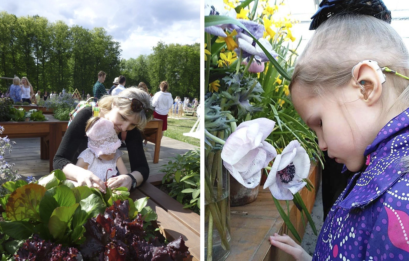 Тифлокомментарий: коллаж из двух цветных фотографий. На снимке слева деревянный стол с растениями в сенсорном саду. На бортик облокотились маленькая девочка в белом кружевном платье и чепчике и светловолосая девушка, стоящая за ее спиной. Девушка нежно держит руки малышки и трогает ими растения. На снимке справа та же девочка в пестрой ветровке нюхает бледно-сиреневый, похожий на мак цветок ветреницы с двумя рядами широких закручивающихся по краям лепестков, расположенных почти горизонтально по отношению к основанию. В центре торчат в разные стороны розовые тычинки с темными пыльниками. Глаза закрыты, светлые волосы убраны назад. На левом ухе слуховой аппарат.