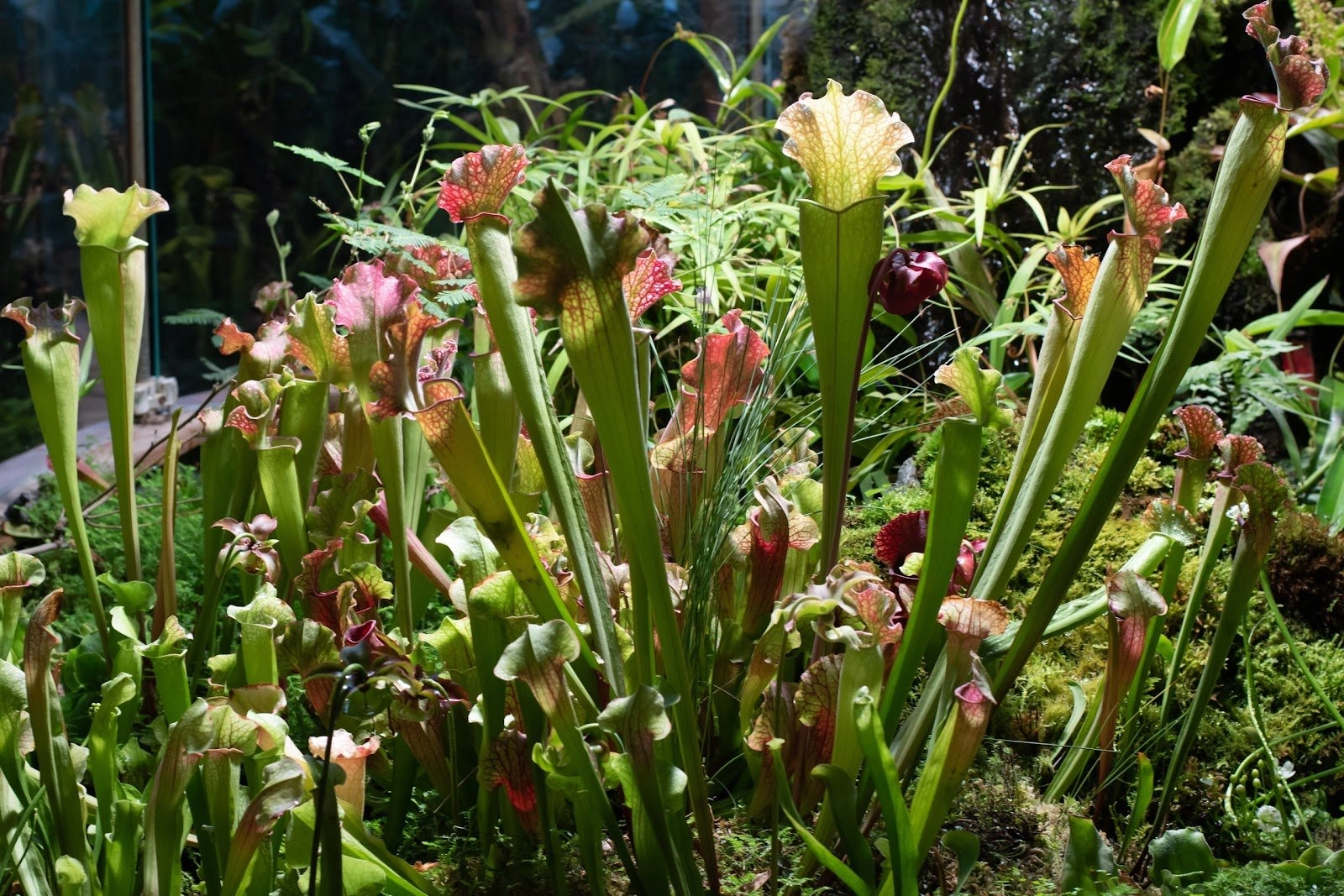 Тифлокомментарий: цветная фотография. Экспозиция насекомоядных растений. Светло-зеленые вытянутые листья саррацении расширяются кверху. Верхняя часть взрослых листьев – красноватая, на вид более тонкая, с волнистыми краями – напоминает стоящие в вазочках цветы. На просвет на них видны тонкие красные прожилки, похожие на капилляры. Рядом растут крупные нежные цветки бордово-зеленого цвета на высоких темных ножках.