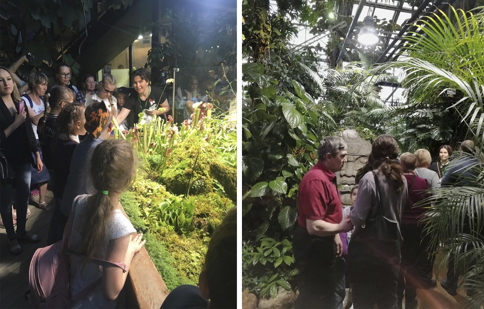 Тифлокомментарий: коллаж из двух цветных фотографий. На снимке слева группа подростков во главе с экскурсоводом – автором статьи Анной Демидовой – стоят около экспозиции с хищными растениями, подсвеченной сверху. У Анны короткое каре, темные волосы, она увлеченно что-то рассказывает. На снимке справа мужчины и женщины идут по дорожке в тропической оранжерее. По сторонам и над ними возвышаются пальмы, папоротники и другие растения. Помещение освещают подвесная лампа и естественный свет, проходящий через стеклянный потолок и стены здания.