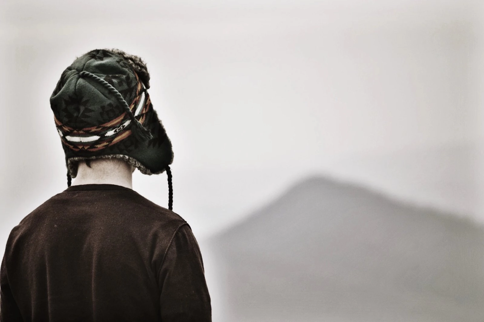 Тифлокомментарий: цветная фотография. Слева спиной к нам стоит молодой человек в коричневой толстовке и ушанке с опущенными незавязанными ушами. Серый головной убор украшен этническим орнаментом по периметру и длинной кисточкой на макушке. Вдали в тумане видны очертания горного хребта.