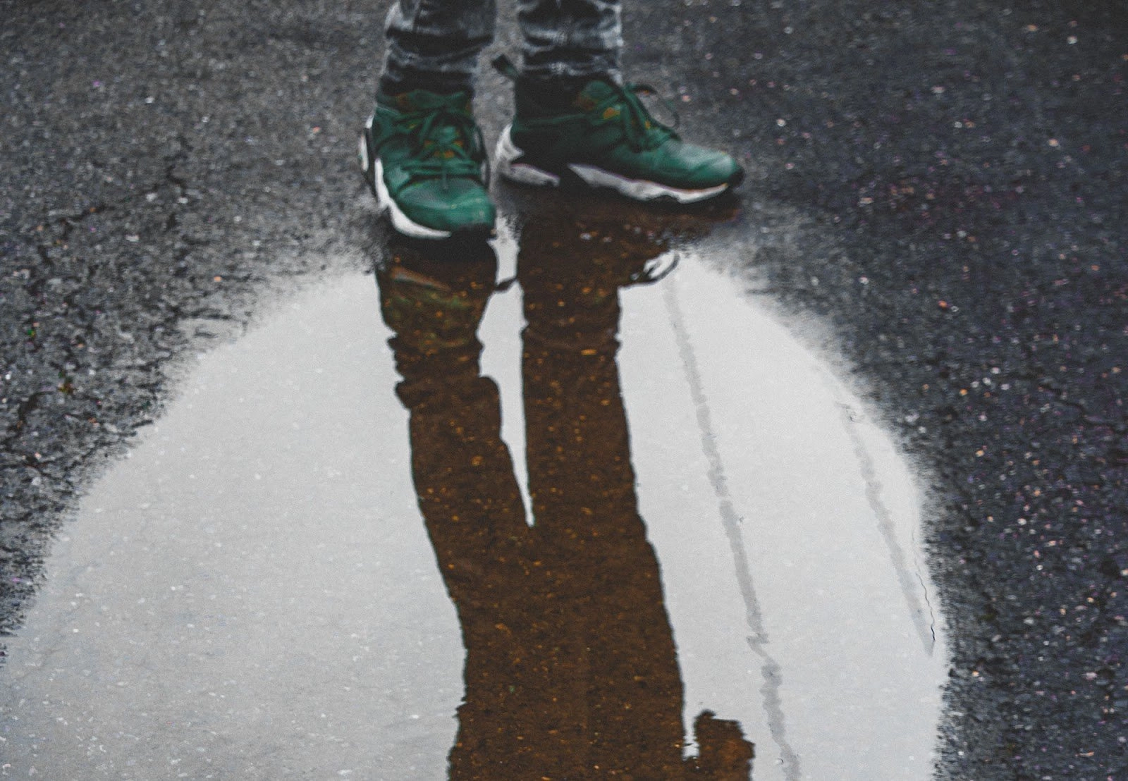 Тифлокомментарий: В круглой луже на асфальте отражается силуэт человека в джинсах и зеленых кроссовках. Края лужи ровные, вода прозрачная.