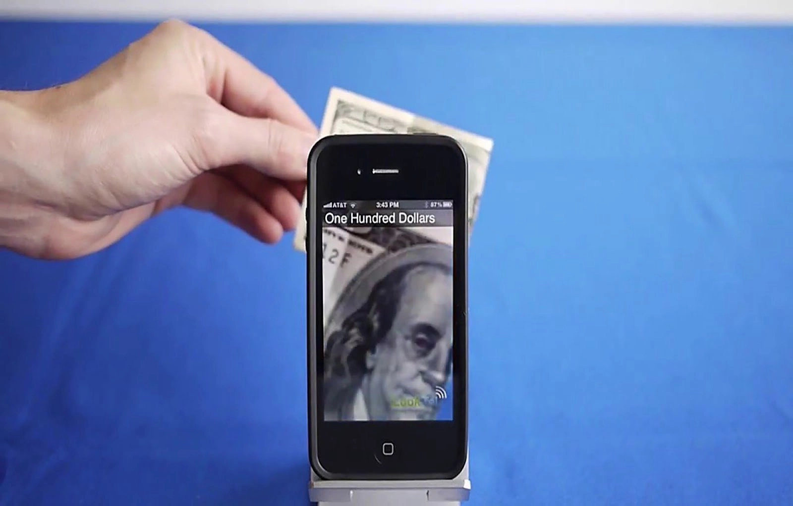 Тифлокомментарий: цветная фотография. На синем фоне смартфон с черным корпусом. За ним рука со стодолларовой купюрой, на которую направлена камера смартфона. На экране увеличенное изображение купюры с портретом Бенджамина Франклина и надпись латиницей в верхней части экрана One hundred dollars. В нижнем правом углу экрана – зелено-синий логотип приложения LookTel: два слова слитно, каждое начинается с заглавной буквы. Над последней буквой изображен белый знак Wi-Fi, развернутый влево: три параллельные дуги, каждая из которых длиннее предыдущей.