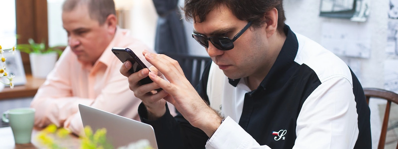 Тифлокомментарий: цветная фотография. Двое мужчин сидят за столом в светлом помещении. Один из них держит в правой руке смартфон, левой касается экрана. На нем белая рубашка с черными вставками, у него короткие темные волосы и черные очки. На столе перед ним раскрыт ноутбук. Второй мужчина в розовой рубашке скрестил руки и смотрит перед собой, нахмурив брови. Перед ним на столе стоит чашка.