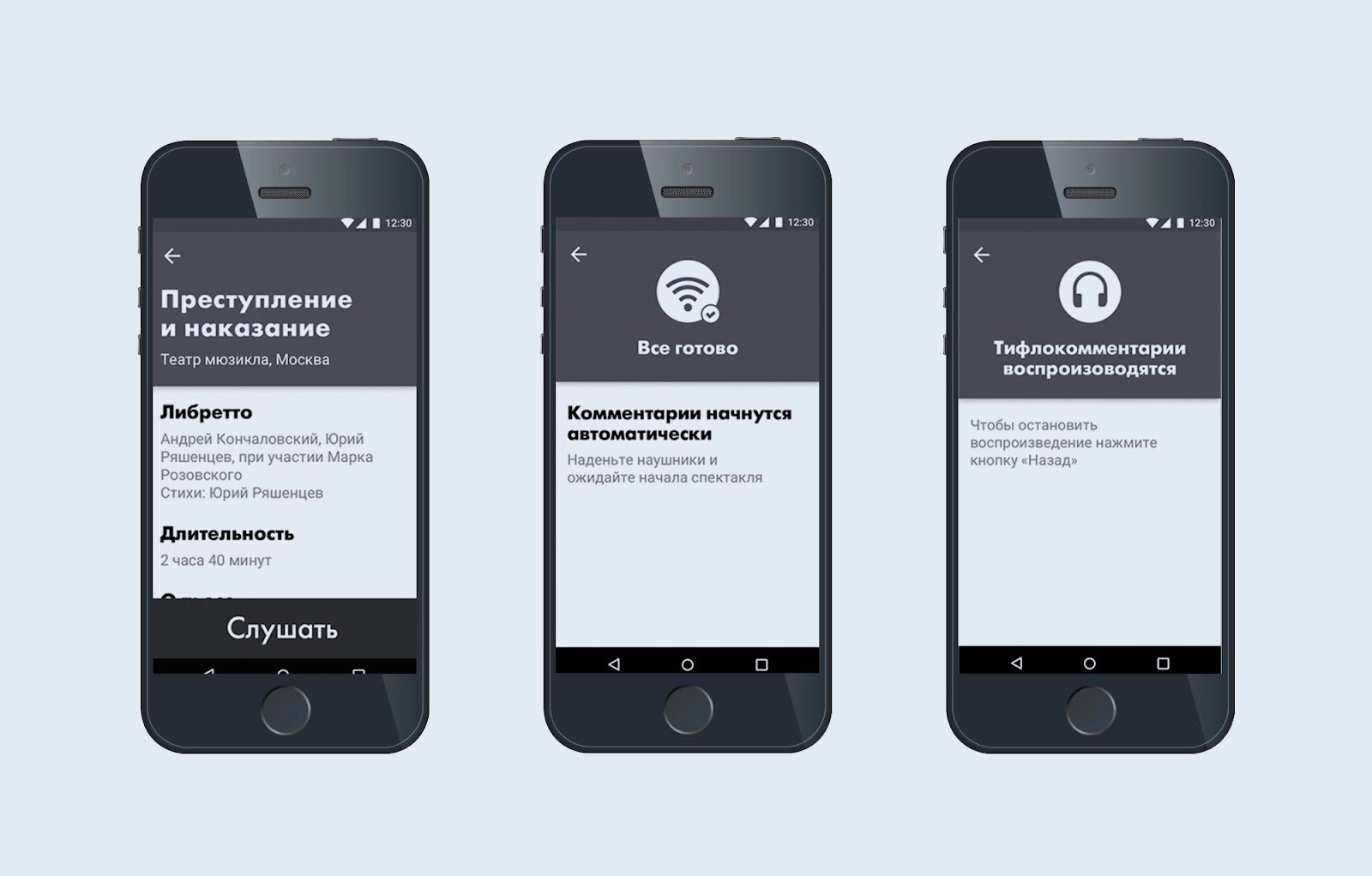 Тифлокомментарий: цветной фотоколлаж. На светло-сером фоне в ряд изображены три смартфона с черным корпусом. На экране каждого устройства открыт интерфейс приложения «Искусство.Вслух»: темно-серая панель сверху и рабочее окно белого цвета. На экране левого смартфона канал спектакля «Преступление и наказание» Театра мюзикла с информацией об авторах и длительности. Внизу экрана серая кнопка с белой надписью «Слушать». На экране центрального смартфона страница перехода к прослушиванию. В рабочем окне надпись: «Комментарии начнутся автоматически. Наденьте наушники и ожидайте начала спектакля». На экране правого смартфона страница воспроизведения тифлокомментария.