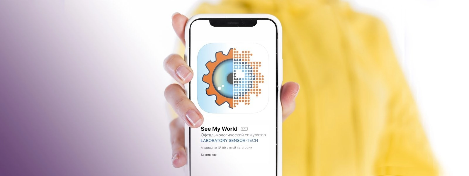 Тифлокомментарий: цветная фотография. В центре фотографии смартфон с большим экраном, его держит девушка на вытянутой руке. На экране логотип приложения See My World и несколько строк текста на английском языке. Логотип представляет собой голубую радужку глаза с темным зрачком, окаймленную оранжевой шестеренкой.