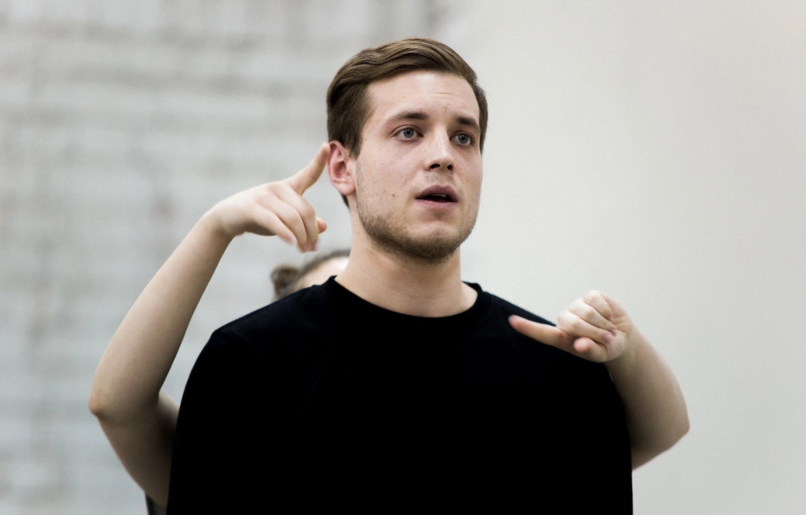 Тифлокомментарий: цветное портретное фото. В центре кадра на белом фоне молодой мужчина, запечатленный по талию. На нем черная футболка с длинными рукавами. У него короткие светло-русые волосы, голубые глаза. Он смотрит вперед. Его рот приоткрыт. За спиной мужчины, почти вплотную к нему, стоит человек, намного ниже его ростом. Видны только его обнаженные до плеч руки с вытянутыми вперед указательными пальцами. Палец одной руки находится на уровне груди мужчины, другой — на уровне его уха.