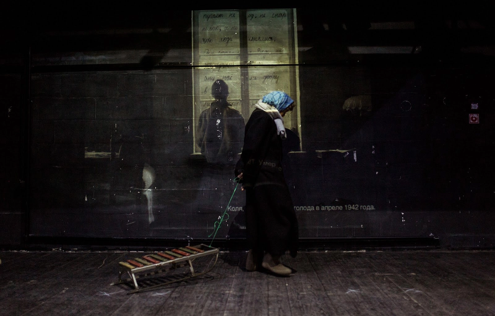 Тифлокомментарий: цветное фото. В помещении перед темной стеной, ссутулившись, проходит женщина в длинном черном пальто. На голове у нее синий платок, шея обмотана шарфом, на ногах валенки. Женщина тянет за собой детские санки. На стену и на пальто женщины ложится проекция изображения: у окна в комнате спиной к зрителю стоит юноша в белой рубашке. Стекла окна закрыты увеличенным пожелтевшим листом письма. Юноша словно читает это письмо. По низу проекции надпись: "Коля умер от голода в апреле 1942 года".