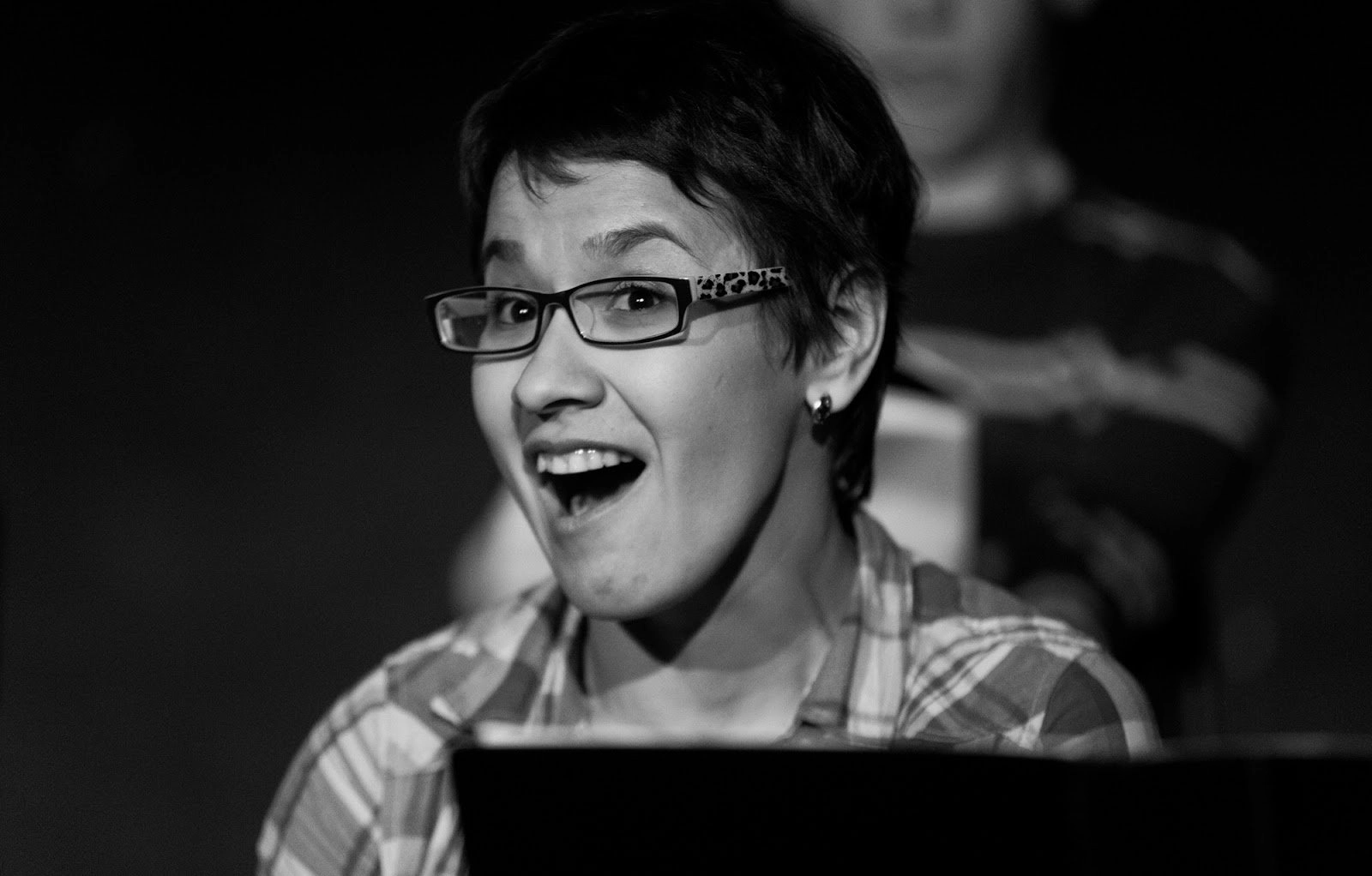 Тифлокомментарий: черно-белое портретное фото. В центре кадра молодая брюнетка, запечатленная по грудь. У нее короткая стрижка. На ней очки прямоугольной формы в черной оправе с широкими дужками с узором под шкуру леопарда. Ее лицо выражает шутливое удивление: брови высоко подняты, а рот приоткрыт.