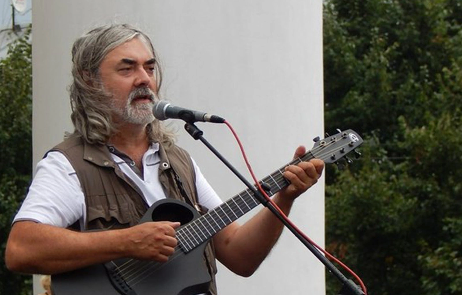 Тифлокомментарий: перед большой белой колонной на фоне зелени стоит мужчина в белой рубашке с короткими рукавами и коричневой жилетке, это руководитель группы Дмитрий Бикчентаев. Он играет на черной гитаре, перед его лицом микрофон, рот мужчины приоткрыт.