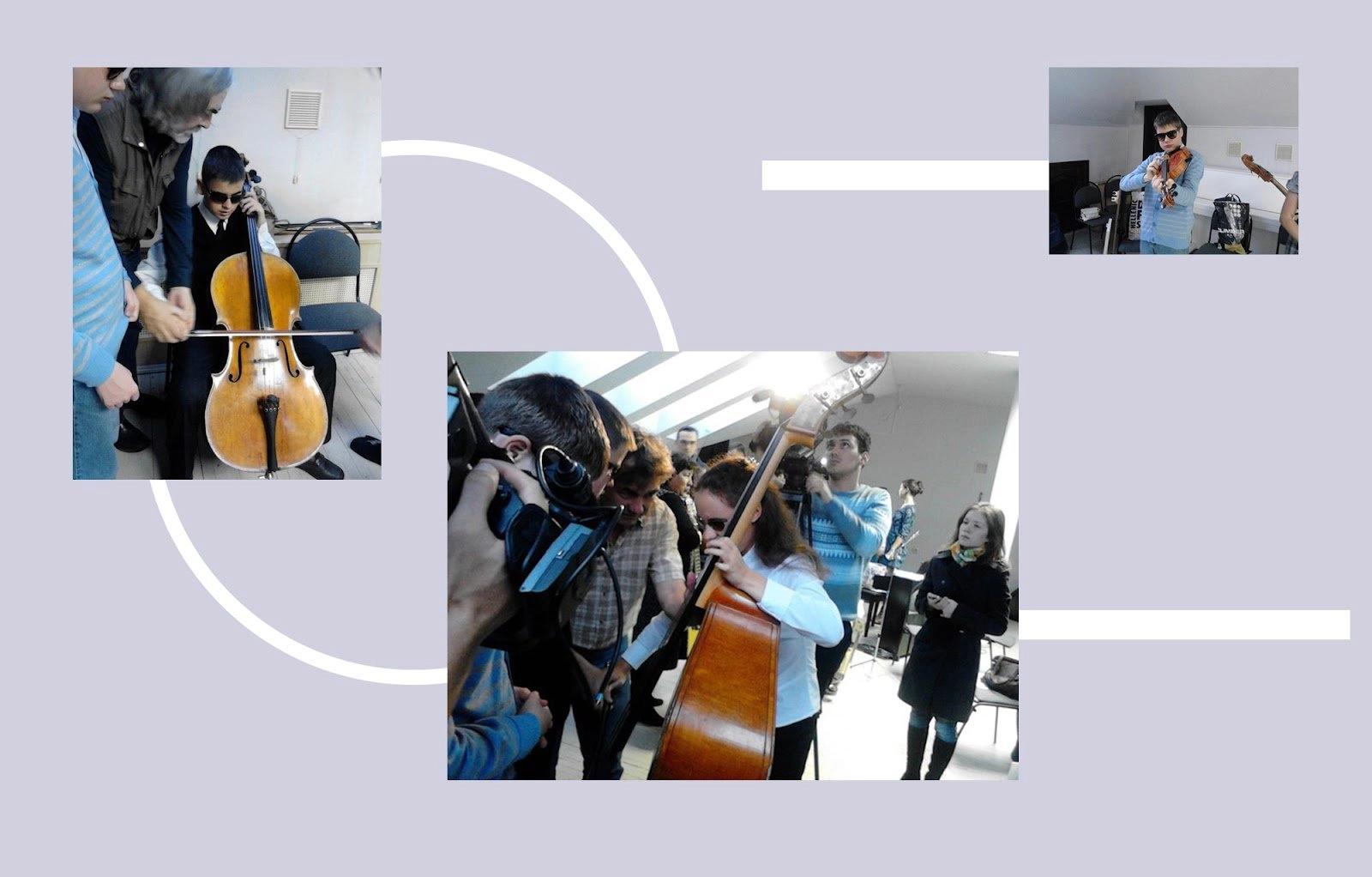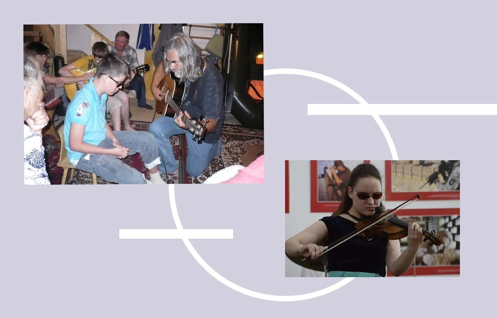 Тифлокомментарий: на сером фоне две фотографии. На первой Дмитрий Бикчентаев в футболке и джинсах стоит на одном колене перед мальчиком лет десяти в черных очках. Дмитрий играет на гитаре, мальчик внимательно слушает. В комнате находятся еще один мальчик с гитарой и взрослые. На второй фотографии Диляра Залялиева в черных очках и концертном платье играет на скрипке.