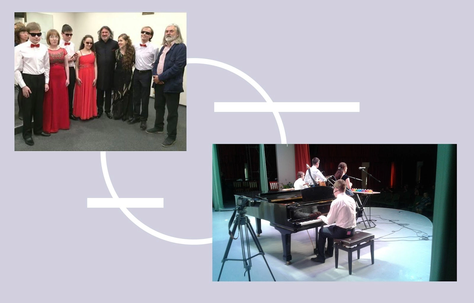 Тифлокомментарий: две небольшие фотографии на сером фоне. На левой ребята и руководители ансамблей стоят полукругом в небольшой комнате. Две девушки в длинных красных платьях, третья девушка в черном платье. Трое юношей в белых рубашках, черных брюках и красных бабочках. Руководитель ансамбля и руководитель камерного оркестра La Primavera Рустем Ябазов — в костюмах. На фотографии справа вид из-за кулис на выступление группы «НеЗаМи». Володя сидит за роялем, Диляра стоит перед стойкой с разноцветными перкуссионными колокольчиками, остальных музыкантов почти не видно за роялем.